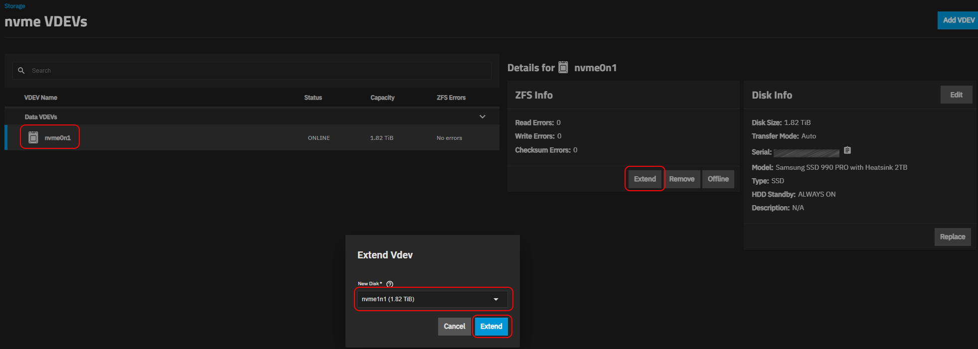 Click the single Disk > Click Extend under ZFS Info > Select the New Disk > Extend